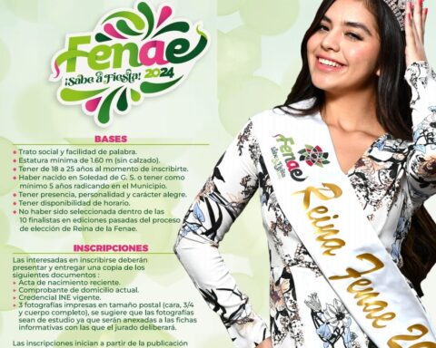 PRÓXIMO 9 DE FEBRERO, CIERRA CONVOCATORIA PARA ELECCIÓN DE REINA FENAE 2024 28 enero, 2024 Destacados·Municipios Al comenzar los preparativos para llevar a cabo en grande la fiesta soledense anual, la Feria Nacional de la Enchilada (FENAE), se Leer más