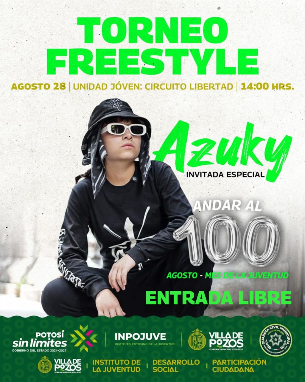 La rapera Azuki será la invitada especial en una jornada que incluirá talleres de freestyle, mercadito emprendedor, premios en efectivo y más actividades que fortalecen sin límites el desarrollo integral de las y los jóvenes tal como lo ha instruido el Gobernador Ricardo Gallardo Cardona