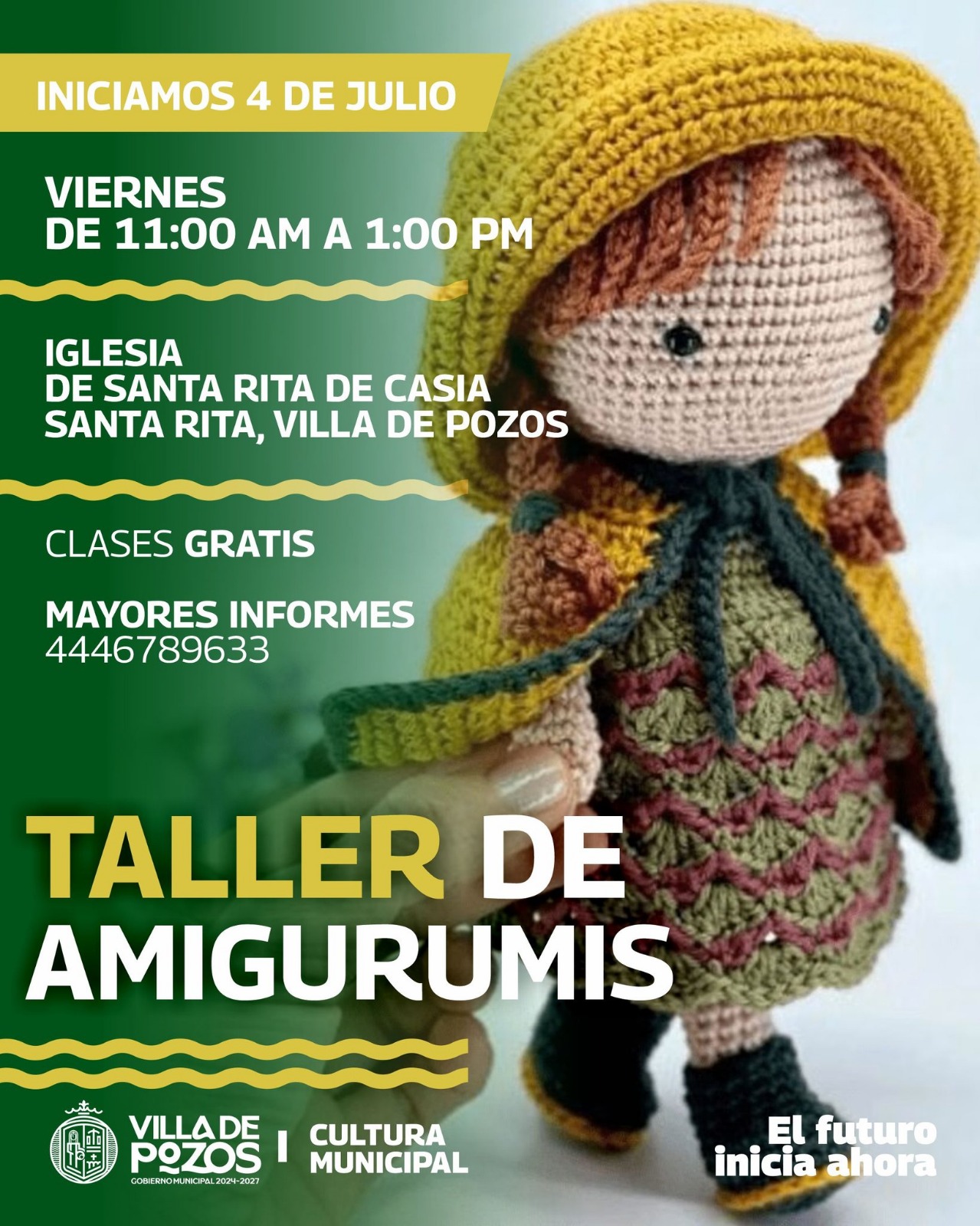 El Gobierno Municipal de Villa de Pozos, por medio de la Dirección de Cultura, abrió un taller gratuito de amigurumis con el objetivo de fomentar la creatividad y brindar nuevas herramientas a la población y se lleva a cabo en la localidad de Santa Rita.