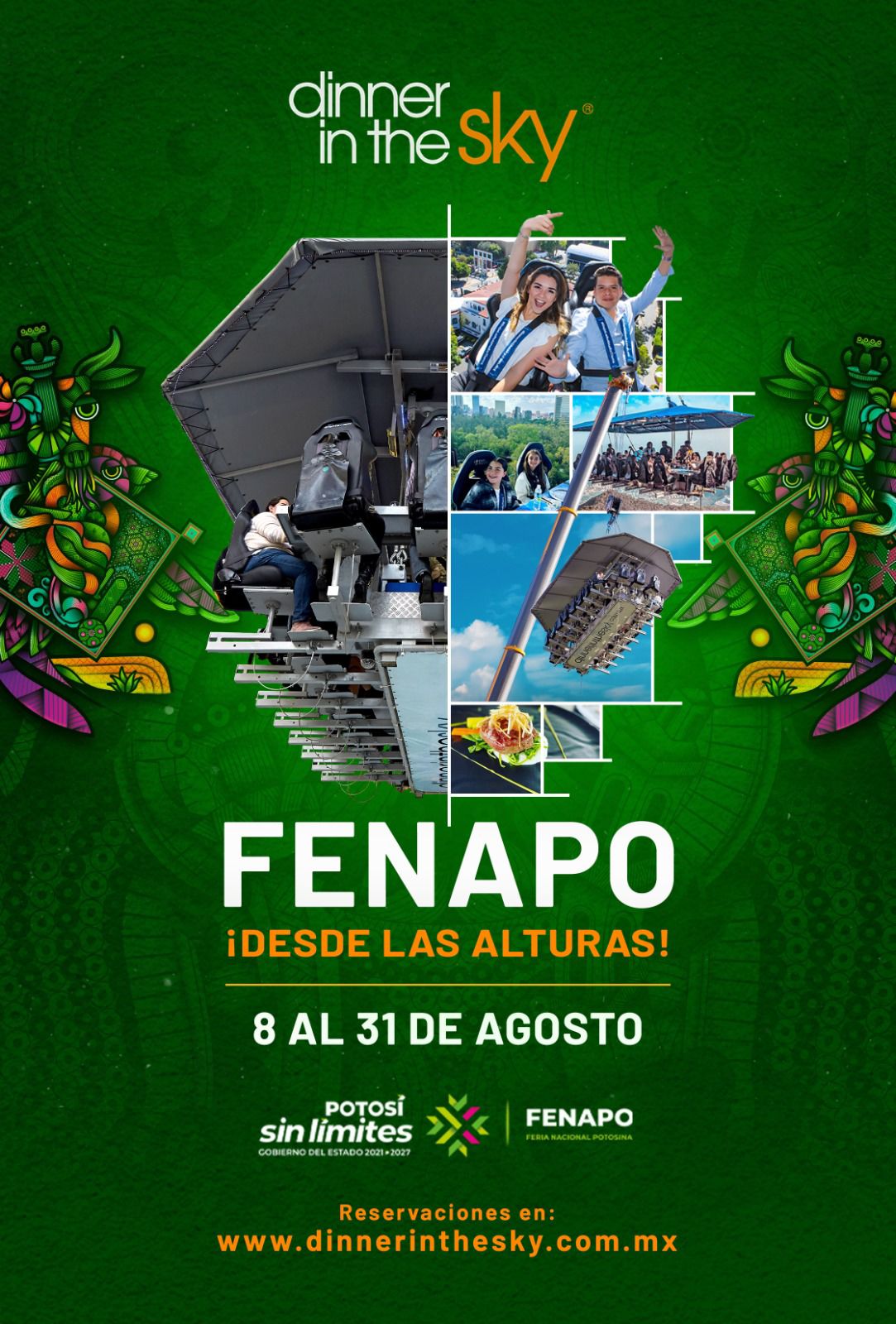Para que las y los potosinos, así como turistas, disfrute sin límites de la edición 2025 de la Feria Nacional Potosina (Fenapo), dicho Patronato anunció que ya se encuentran disponibles, las reservaciones para Dinner In The Sky una experiencia que se presentará por primera vez en la mejor mejor Feria de Mexico que ofrece una cena gourmet a 45 metros de altura con impresionantes vistas.