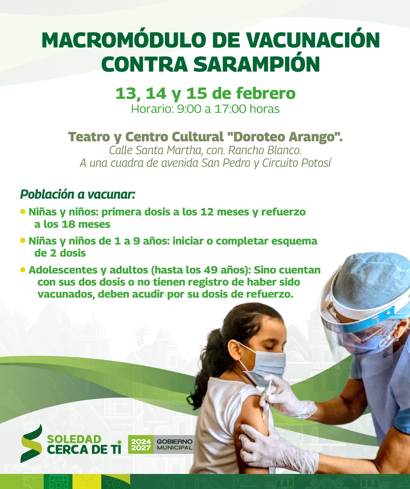 - El Ayuntamiento de Soledad de Graciano Sánchez, en coordinación con la Secretaría de Salud, pone en marcha una jornada de vacunación del 13 al 15 de febrero en el Teatro Doroteo Arango, para reforzar la protección de niñas, niños y personas en riesgo.