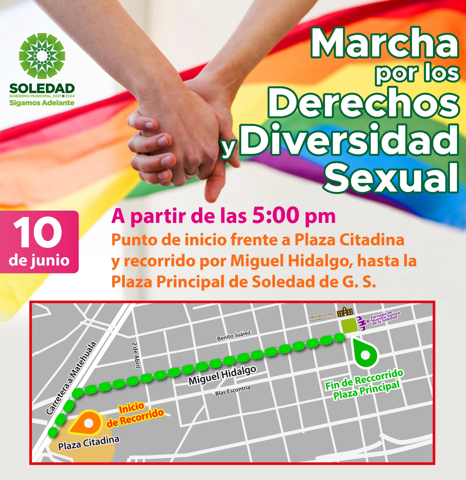 En apoyo y fomentando la inclusión, la libre expresión y el respeto a la diversidad sexual, el Ayuntamiento de Soledad de Graciano Sánchez invita a la población en general a ser parte de la Marcha por los Derechos y la Diversidad Sexual, hoy sábado.