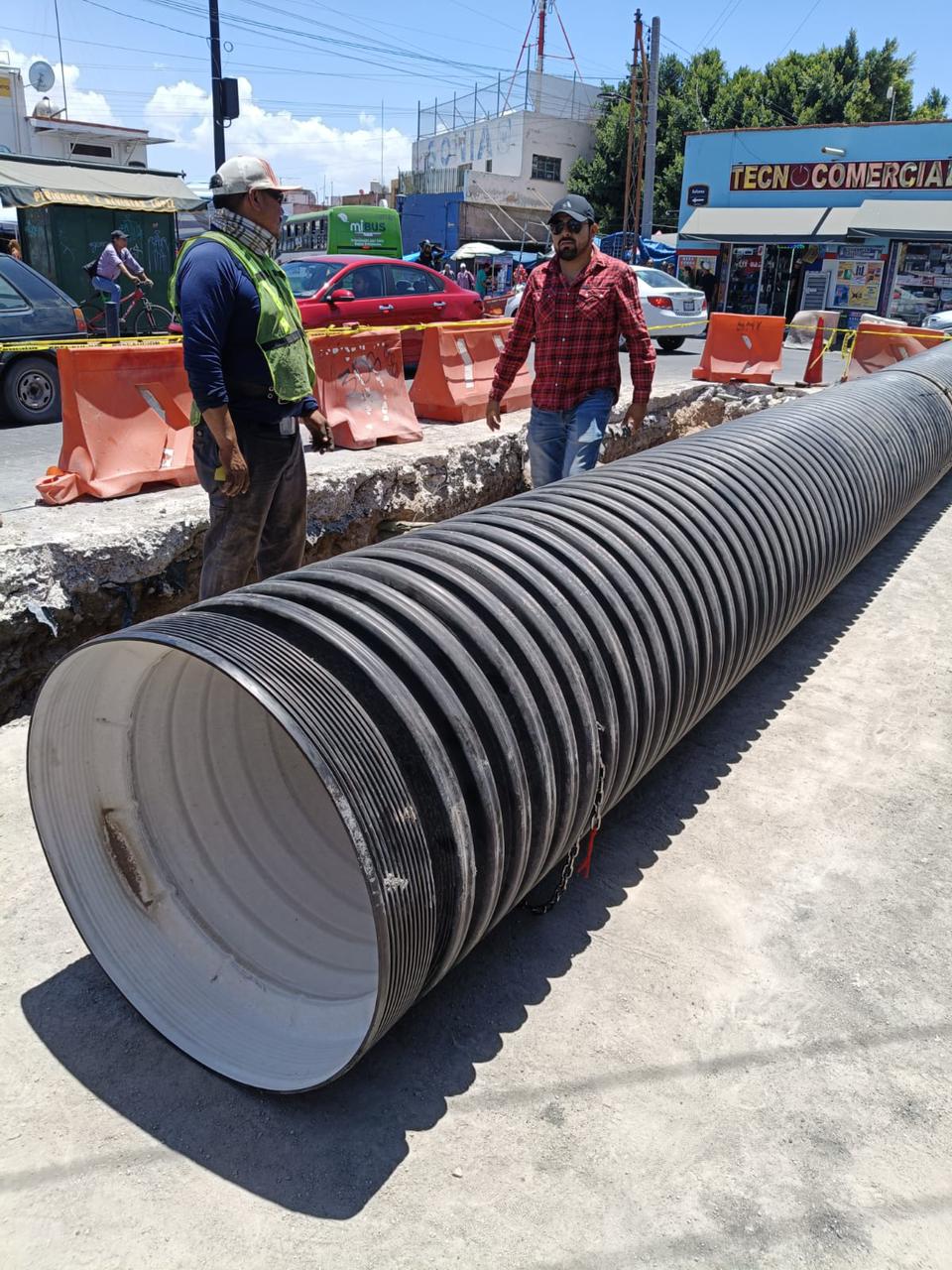SLP.– INTERAPAS avanza con la rehabilitación sanitaria en la calle 16 de Septiembre, entre Reforma y Privada 16 de Septiembre, en inmediaciones del mercado República. En esta etapa, el personal del organismo ha concluido el retiro de la tubería antigua para dar paso a la instalación de la nueva línea de drenaje sanitario de PEAD de 18 pulgadas.