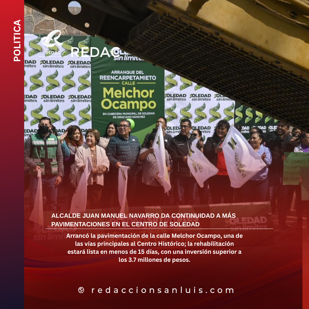 Continuando con la transformación de vialidades, para convertirlas en dignas y seguras para las familias de Soledad de Graciano Sánchez; el Alcalde, Juan Manuel Navarro Muñiz dio inicio a los trabajos de pavimentación de la calle Melchor Ocampo en la Cabecera Municipal, obra que responde al compromiso de atender con cercanía las necesidades de la gente y fortalecer la movilidad, el desarrollo económico, la plusvalía y la seguridad de habitantes y visitantes.