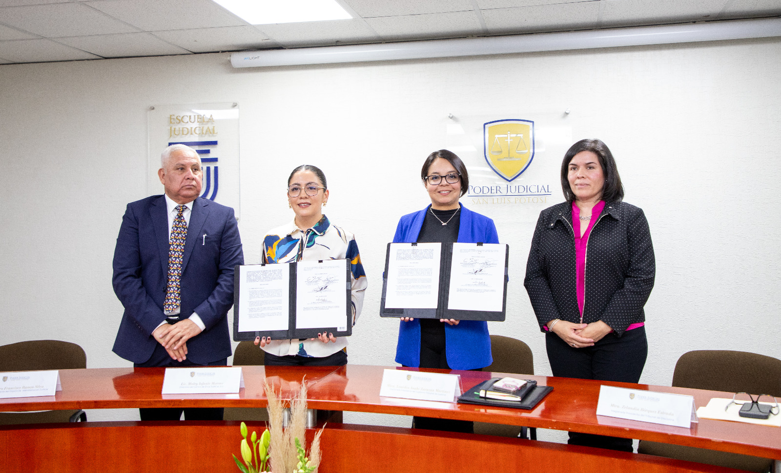La firma del convenio estuvo a cargo de la Magistrada Lourdes Anahí Zarazúa Martínez, Presidenta del Supremo Tribunal de Justicia; de la Magistrada Zelandia Borquez Estrada, Presidenta del Tribunal de Disciplina Judicial; el Consejero Francisco Ramos Silvia, Presidente del Órgano de Administración Judicial y la Licenciada Maley Infante Moreno, Directora del Centro de Ética Judicial, A.C.